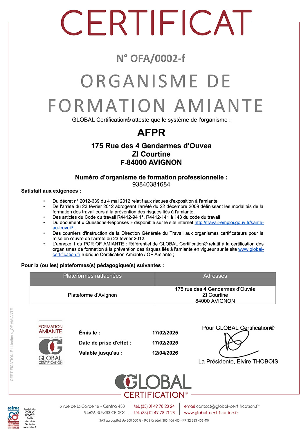 Nous avons obtenu la certification OF AMIANTE n°OFA/002 le 13 avril 2017 auprès de l’organisme Global Certification®. Dans un souci d’évolution constant, nous sommes audités chaque année et notre certificat est renouvelé tous les trois ans.